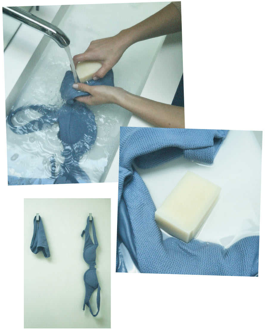 The chemicals in washing machine detergents are often too harsh and can damage the fibers of your bikini. To keep it soft and smooth, we recommend using a mild soap (even hand soap!).