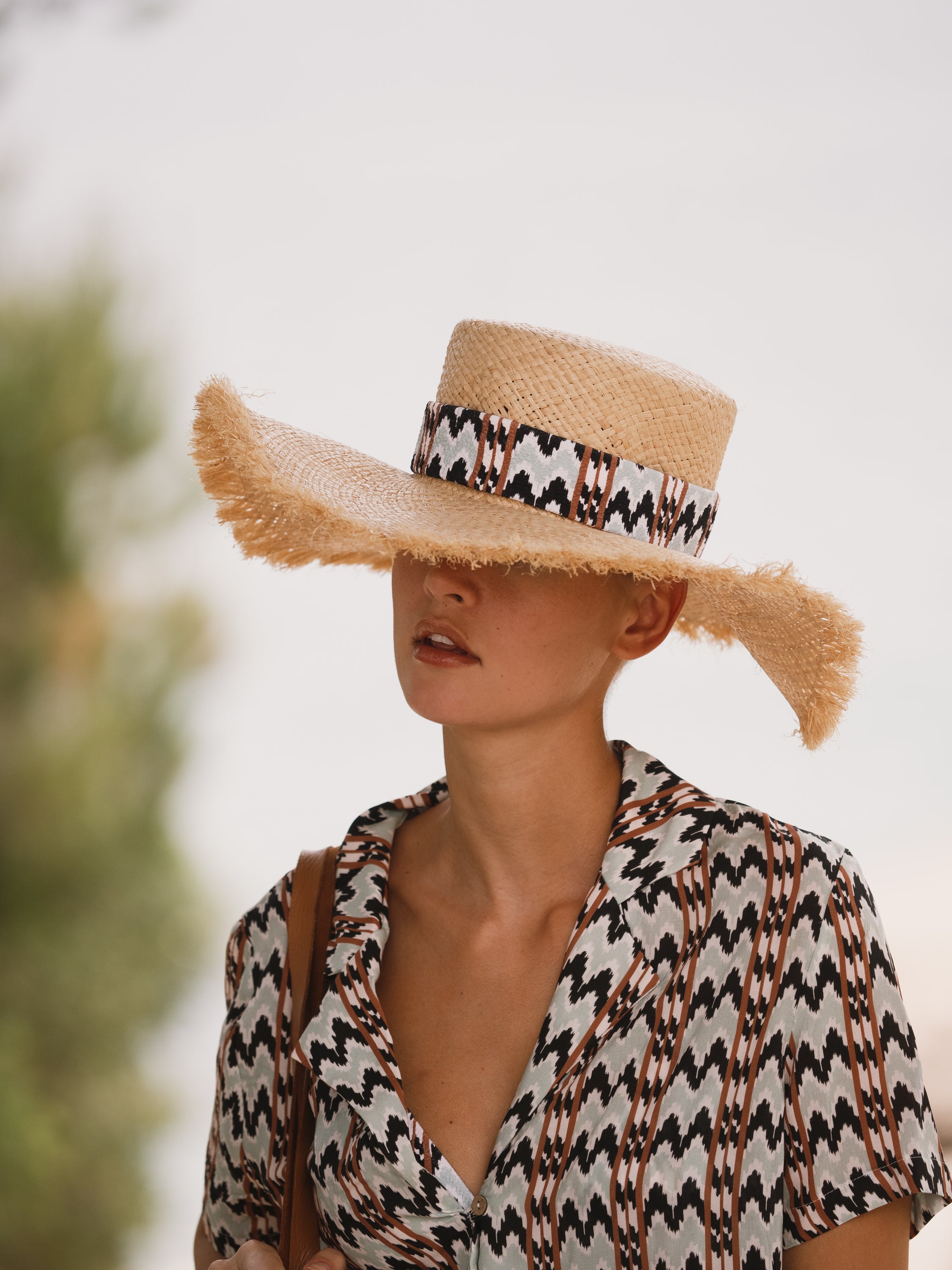 Valldemosa shirt in lightweight viscose, with ikat print in ice, brown and black tones on a raw background.