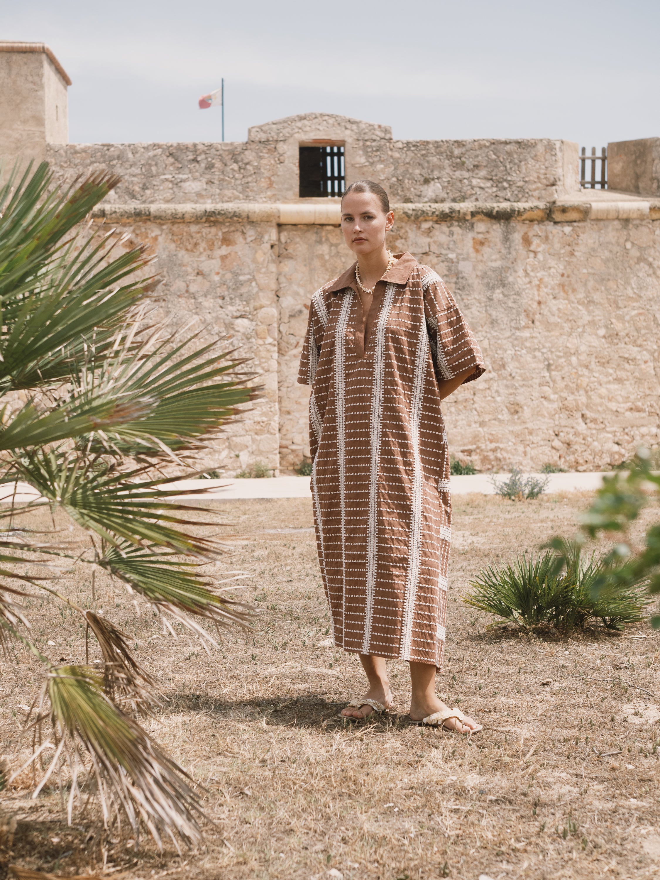 Catania poncho in brown with ethnic vertical stripe embroidery with geometric patterns in a raw tone.