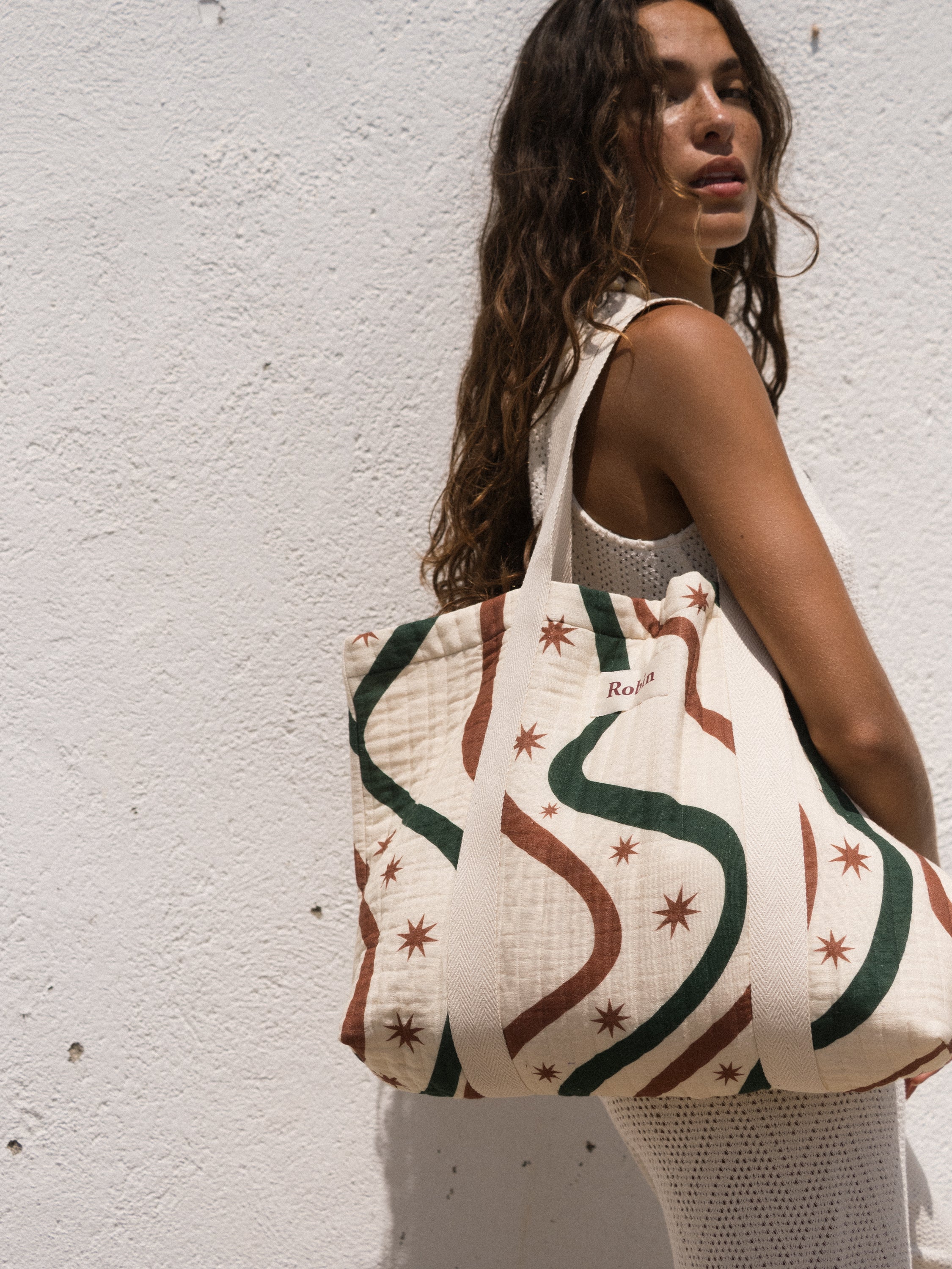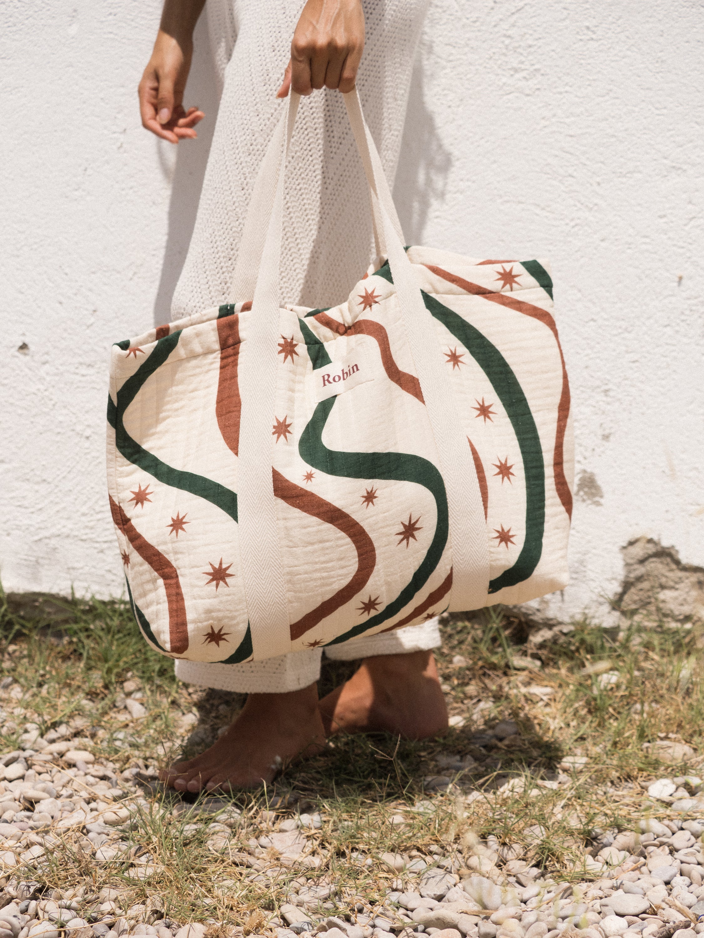Bolsa Meteoro de gran capacidad, confeccionada con tejido acolchado de color crudo con estampado de rayas onduladas y estrellas en tonos verde y terracota.