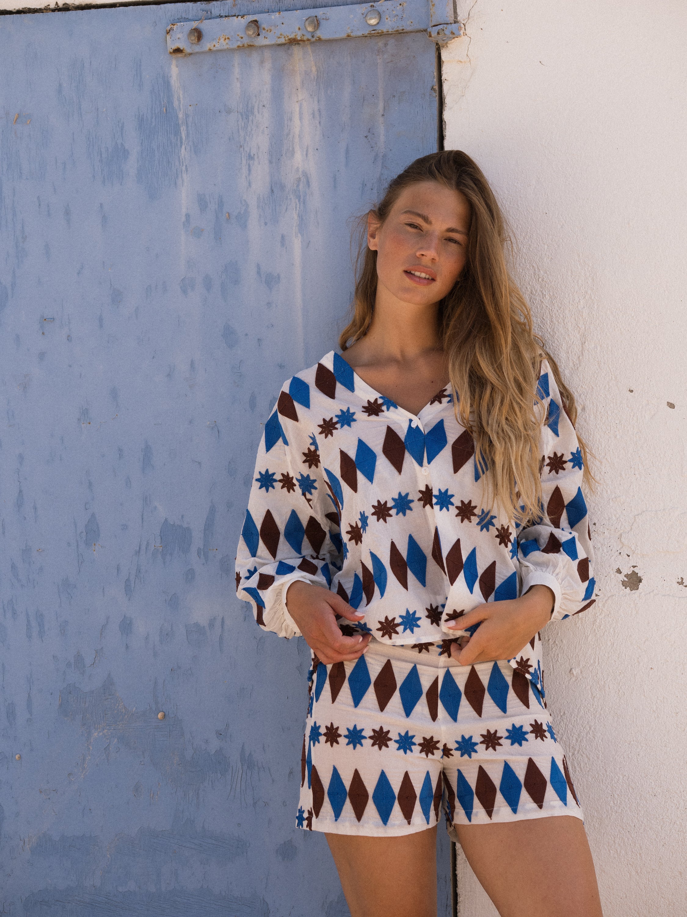 Camisa Vesper de color crudo con tejiduría de rombos y estrellas en tonos azul y marrón.