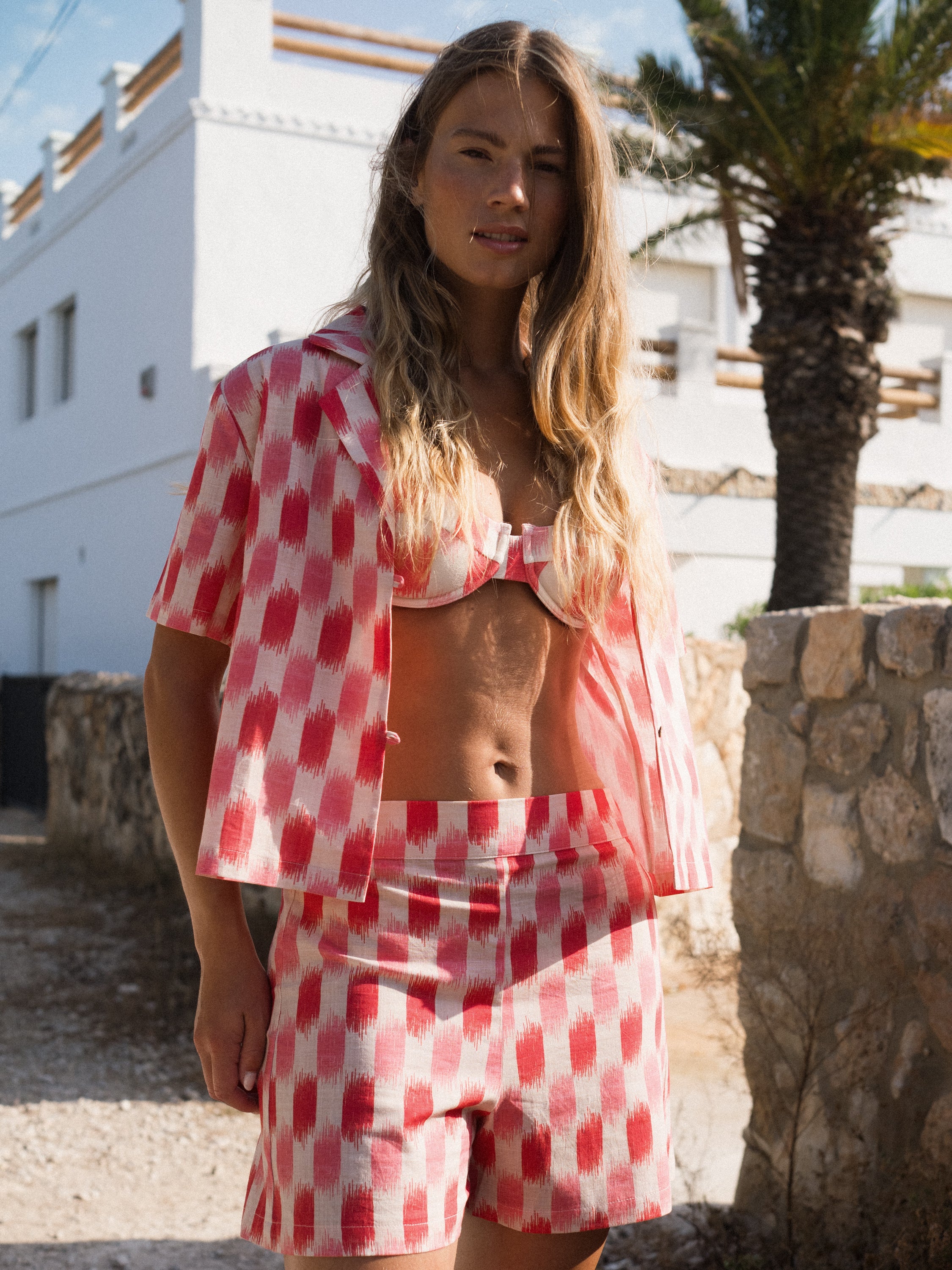 Short Tramuntana de algodón orgánico con estampado de cuadros ikat mallorquines en tonos rosas y blancos.